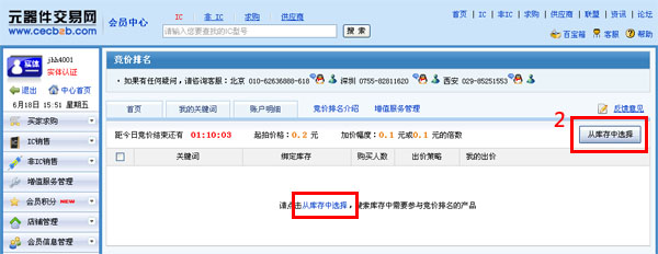 2、點擊“我要參與競價”,從您發布的庫存中選擇要參與競價的庫存,并設置關鍵詞,每次可以選擇多條,進行批量競價。