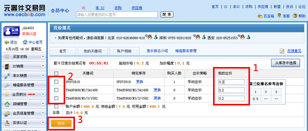 1、在關鍵詞出價頁面,對已選擇的關鍵詞一一出價,輸入框右側會顯示當前關鍵詞的前3名參考價格,最后點擊“購買”按鈕結束整個流程。