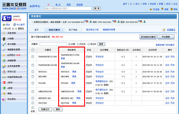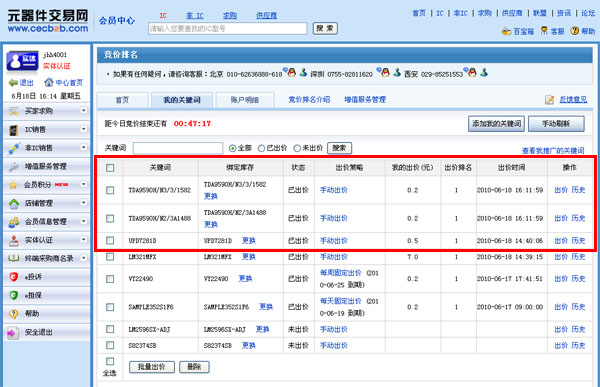 當日17:00競價成功后,競價成功的關鍵詞所對應的產品信息會在次日00:00展示在元器件交易網搜索結果頁前三位,效果如下圖:
